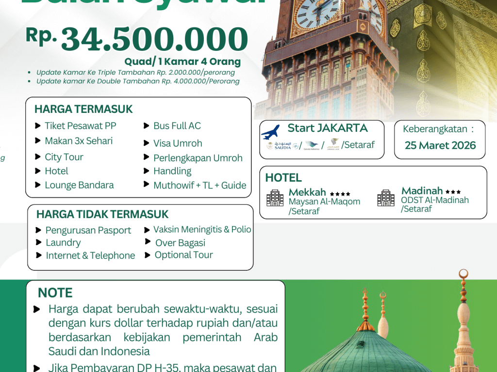 - Perlengkapan : Koper kabin, koper bagasi, tas paspor, kain ihram/mukena, sandal, buku manasik, kain seragam, syal, & sabuk