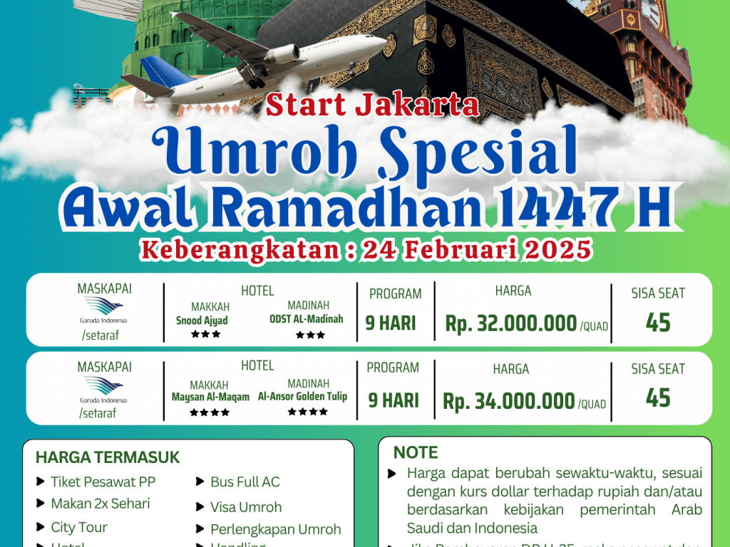 - Perlengkapan : Koper kabin, koper bagasi, tas paspor, kain ihram/mukena, sandal, buku manasik, kain seragam, syal, & sabuk